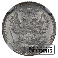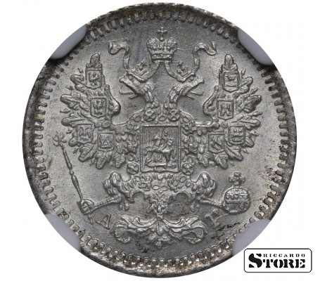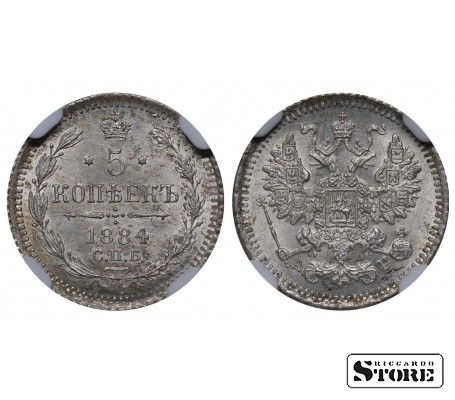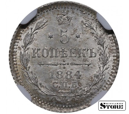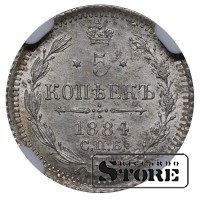 Vene Impeeriumi hõbemünt nimiväärtusega 5 kopikat, välja antud 1884. aastal Peterburi rahapajas keiser Aleksander III (1881–1894) valitsemise ajal. Materjal — hõbe, kaal 0,9 g. Sertifitseeritud NGC hinnanguga UNC DETAILS. Väga hästi säilinud kollektsioneerimismünt.