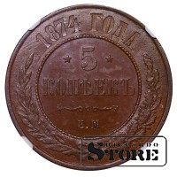 Vaskist 5 kopika münt Vene Keisririigist aastast 1874, vermitud Jekaterinburgi rahapajas (rahapaja tähis “ЕМ”). Kuulub Aleksander II aegse tavalise käibeseeria tüüpi (1867–1876). Aversil keisririigi kahepäine kotkas, reversil nimiväärtus ja aastaarv pärjas. Metall: vask, rihveldatud serv. Tüübi andmed: kaal 16,38 g, läbimõõt 32,7 mm; WWC number Y#12.1 / KM-Y12.1, Bitkin #399. Eksemplar on NGC poolt hinnatud MS 62 BN (Mint State 62, Brown).