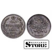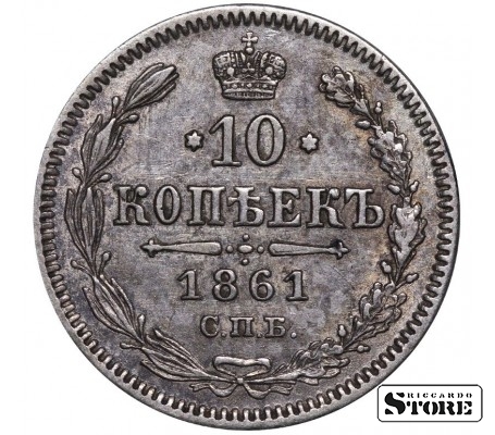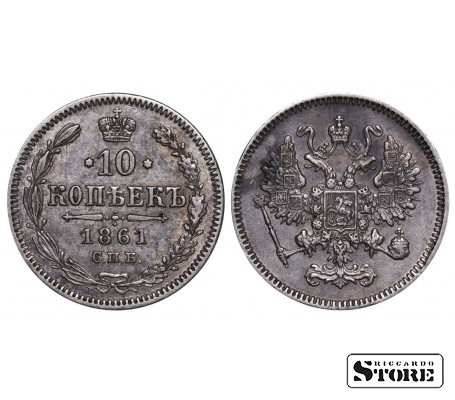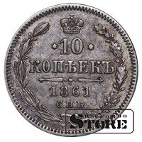 Russian Empire coin with a denomination of 10 Kopecks, issued in 1861 during the reign of Emperor Alexander II (1855–1881). Composition — silver, weight 2.04 g.