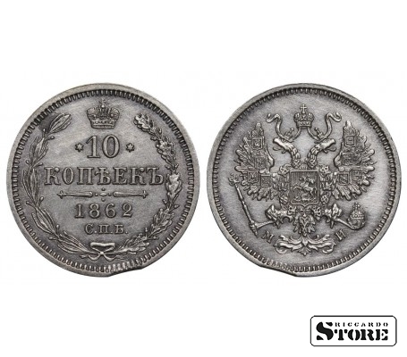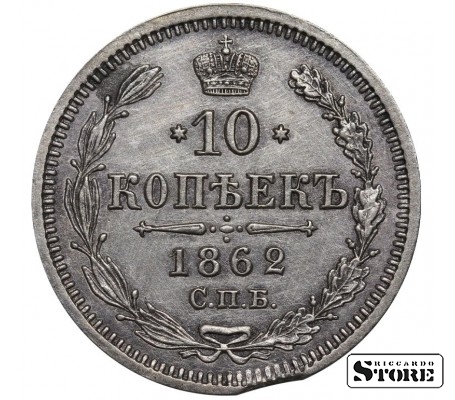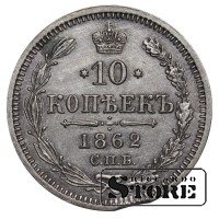 Russian Empire coin with a denomination of 10 Kopecks, issued in 1862 during the reign of Emperor Alexander II (1855–1881). Composition — silver, weight 2.04 g.