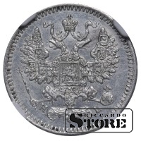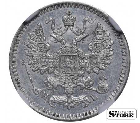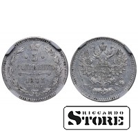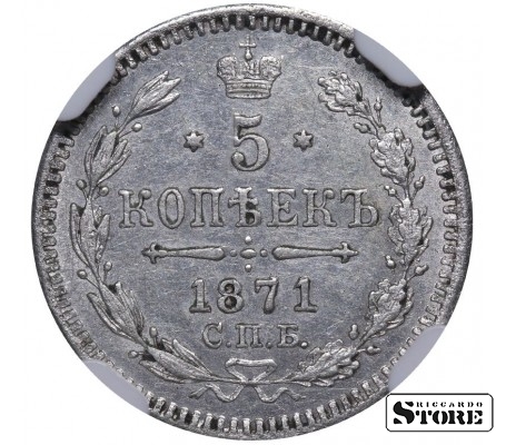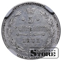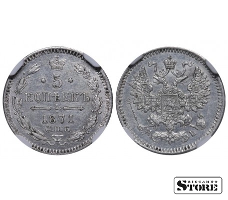 Russian Empire coin with a denomination of 5 Kopecks, issued in 1871 during the reign of Emperor Alexander II (1855–1881). Composition — silver, weight 0.9 g. Certified by NGC with a grade of UNC DETAILS.