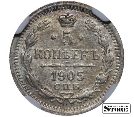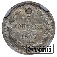 Russian Empire, 5 Kopecks, 1905 year, SPB-AR, NGC MS 62, Nicholas II