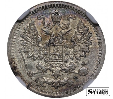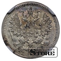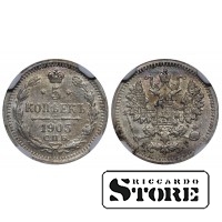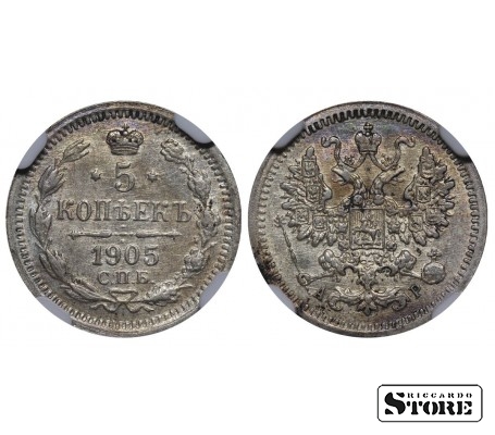 Russian Empire coin with a denomination of 5 Kopecks, issued in 1905 during the reign of Emperor Nicholas II (1894–1917). Composition — silver, weight 0.9 g. Certified by NGC with a grade of MS 62.