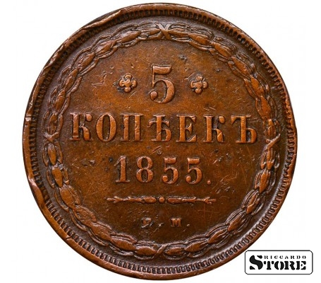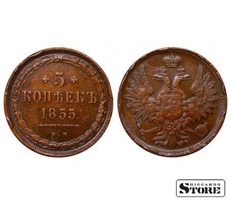 Russian Empire coin with a denomination of 5 Kopecks, issued in 1855 during the transitional period between the reigns of Nicholas I (1825–1855) and Alexander II (1855–1881). Composition — copper, weight 25.59 g.