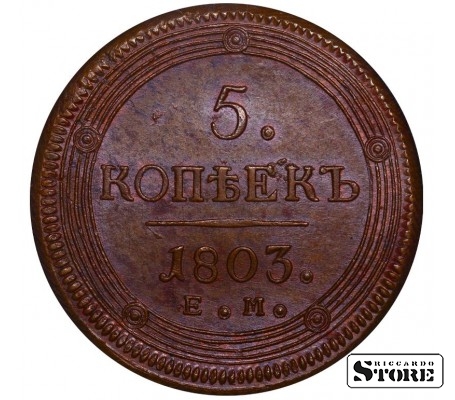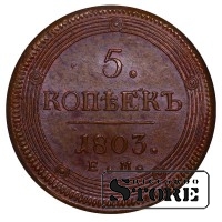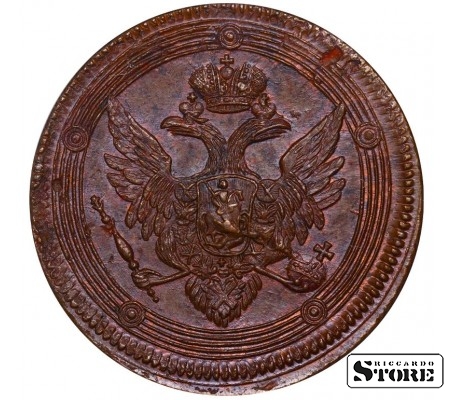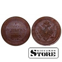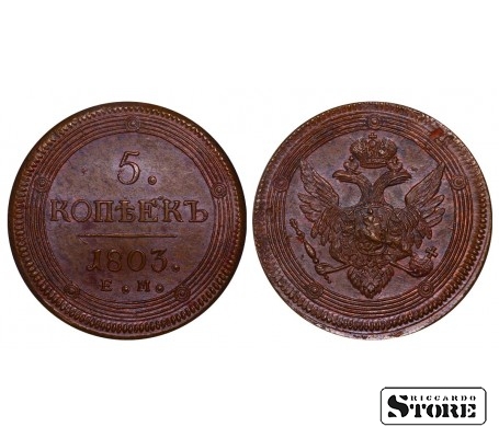 Russian Empire copper coin with a denomination of 5 Kopecks, issued in 1803 at the Yekaterinburg Mint during the reign of Emperor Alexander I (1801–1825). Composition — copper, weight 51.19 g. Certified by NGC with a grade of MS 62 BN. Beautifully preserved coin with rich brown toning and strong details.