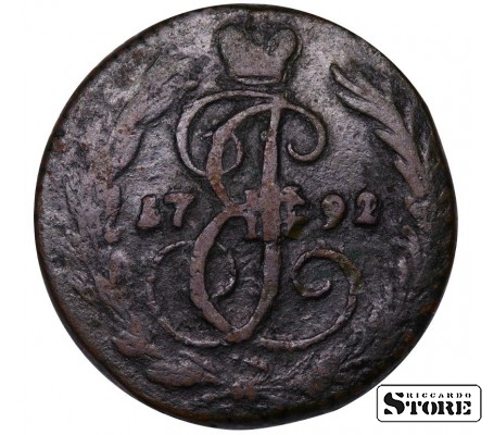 Rare Russian Empire coin with a denomination of 1 Denga, issued in 1792 during the reign of Empress Catherine II (1762–1796). Composition — copper, weight 5.12 g. Catalog references: C#56.1, Bitkin 878 (R2), Br 93 (line), Ilyin 5 rub.
