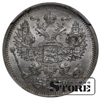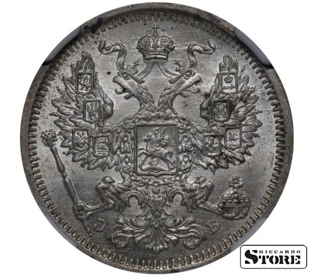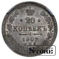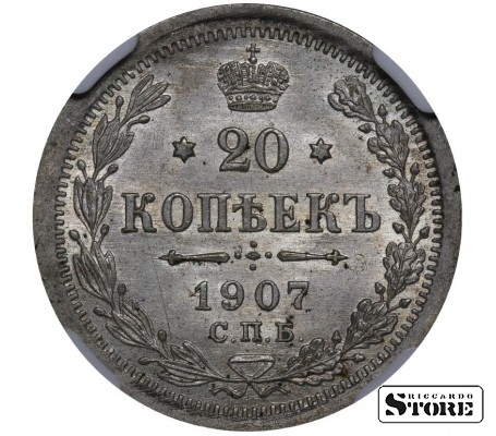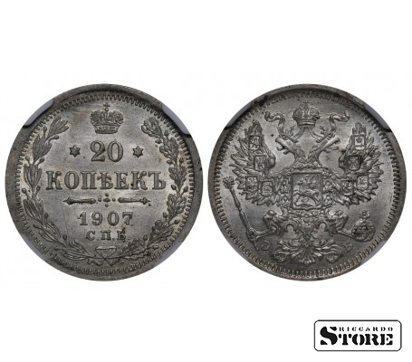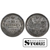 Krievijas Impērijas monēta ar nominālu 20 kapeiku, izdota 1907. gadā imperatora Nikolaja II (1894–1917) valdīšanas laikā. Materiāls — sudrabs, svars 3,6 g. Novērtējums NGC — UNC DETAILS.