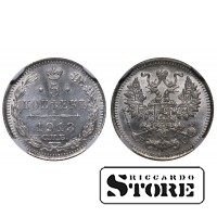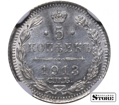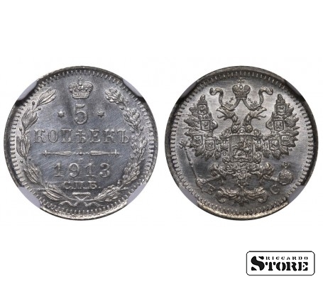 Monēta no Krievijas Impērijas ar nominālu 5 kopeikas, izdota 1913. gadā Nikolas II valdīšanas laikā. Stāvoklis UNC DETAILS, materiāls — sudrabs (.500). Svars ~1.2 g, diametrs ~15.5 mm. Standarta apgrozības monēta ar reibotu maliņu.