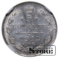 Krievijas Impērija, 5 kopeikas, 1913. gads, sudrabs, NGC UNC DETAILS