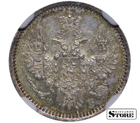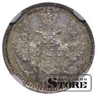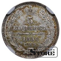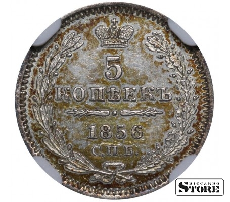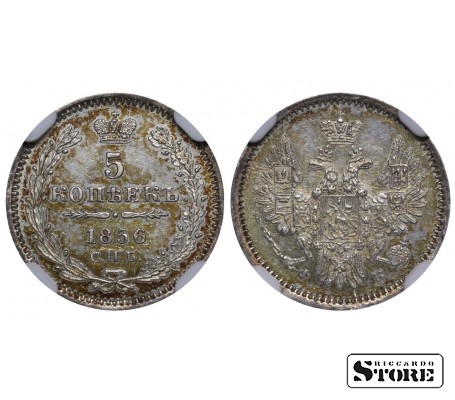 Krievijas Impērijas monēta ar nominālu 5 kapeikas, izdota 1856. gadā Sanktpēterburgas kaltuvē imperatora Aleksandra II (1855–1881) valdīšanas laikā. Materiāls — sudrabs, svars 1,04 g. Sertificēta ar NGC novērtējumu MS 62. Izcili saglabājies kolekcionējams eksemplārs.