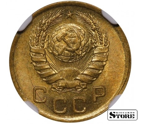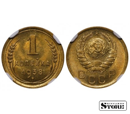 PSRS 1 kapeikas monēta ar 1938. gada datējumu, kalta no alumīnija-bronzas sakausējuma. Tā ir standarta apgrozības monēta sērijā 1937–1946: aversā PSRS ģerbonis ar 11 lentēm un uzrakstu “СССР”, reversā nomināls un gada skaitlis kviešu vārpu vainagā. Tipiskie parametri: svars 1 g, diametrs 15 mm, WWC numurs Y#105 (arī KM#105). Šis eksemplārs sertificēts NGC ar vērtējumu MS 65.