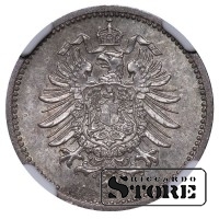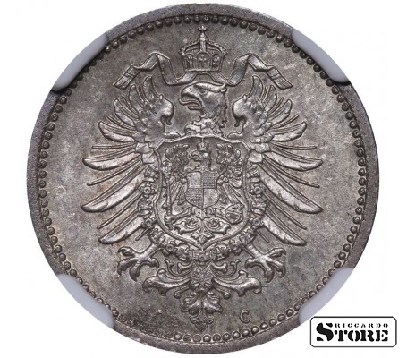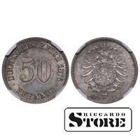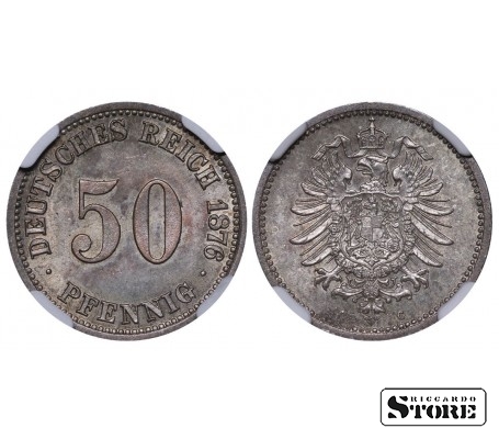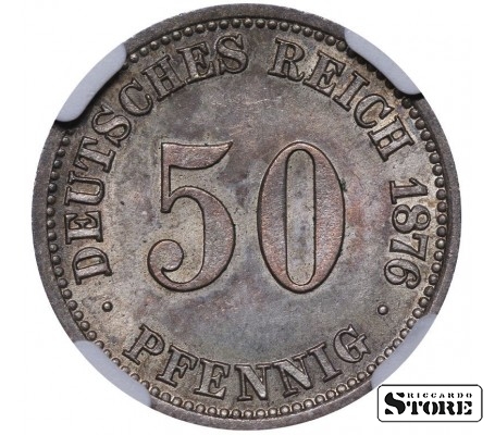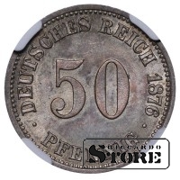 Vācijas impērijas monēta ar nominālu 50 pfeningi, izdota 1876. gadā Frankfurtes (C) kaltuvē. Stāvoklis MS 64, materiāls — sudrabs (0,900). Svars 2,78 g, diametrs 20,00 mm, mala rievota. Parasta sudraba apgrozības monēta Vilhelma I laikos.