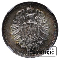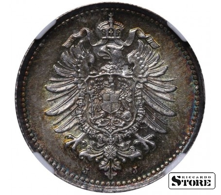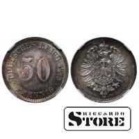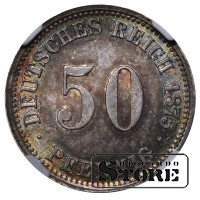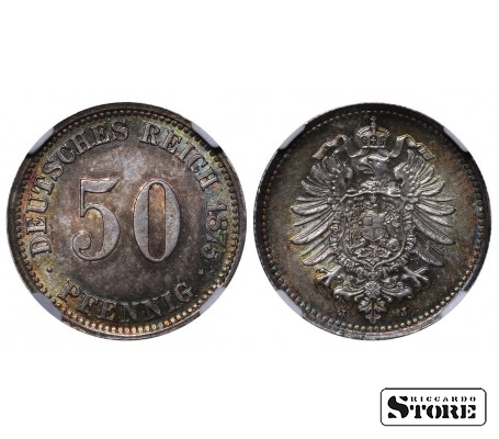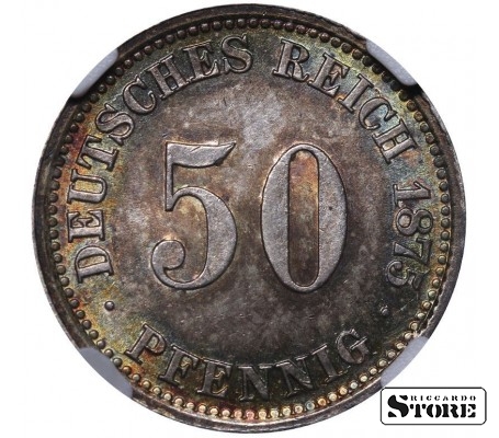 Vācijas Impērijas monēta ar nominālu 50 pfeningi, izdota 1875. gadā Hamburgas (J) kaltuvē. Stāvoklis MS 64, “Top Pop” (viens no labākajiem populācijā), materiāls — sudrabs (0,900). Svars 2,78 g, diametrs 20,00 mm, mala rievota. Vēsturiska sudraba monēta Vilhelma I periodā.