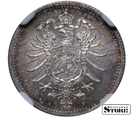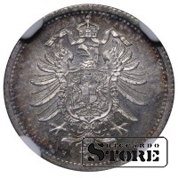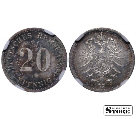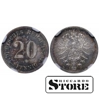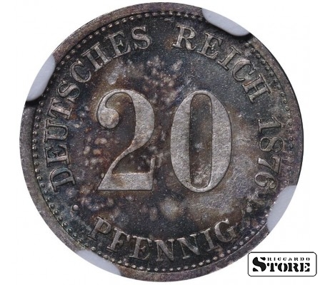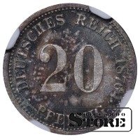 Vācijas Impērijas monēta ar nominālu 20 pfeningi, izdota 1876. gadā Hannoveras (H) kaltuvē. Stāvoklis MS 64, “Top Pop” (viens no labākajiem populācijā), materiāls — sudrabs (0,900). Svars 5,56 g, diametrs 22,50 mm, mala rievota. Klasiska sudraba monēta Vilhelma I laikos.