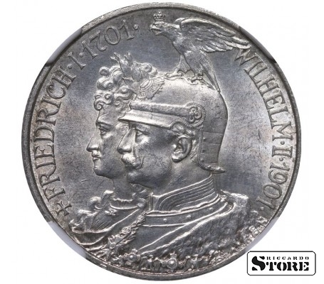 Королевство Пруссия, 2 марки, 1901 год, 200 лет Королевству Пруссия, NGC UNC DETAILS, Вильгельм II