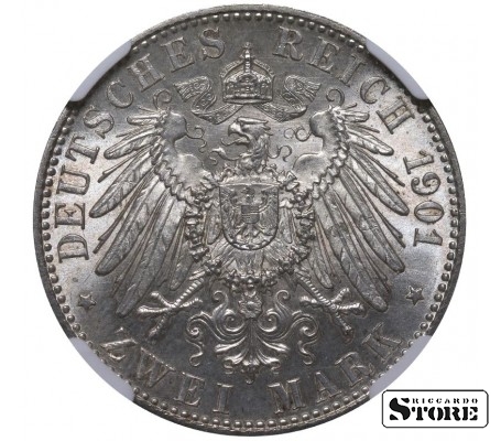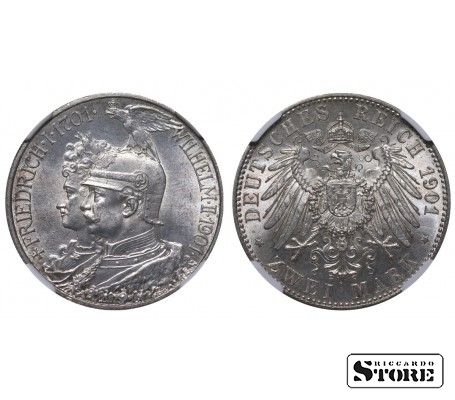 Памятная монета Королевства Пруссия номиналом 2 марки, выпущенная в 1901 году к 200-летию основания Королевства Пруссия. На аверсе изображён король Вильгельм II (1888–1918). Материал — серебро, вес 11,111 г. Сертифицирована NGC с оценкой UNC DETAILS. Исторически значимый выпуск Германских земель, посвящённый юбилею династии Гогенцоллернов.