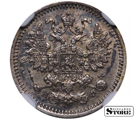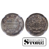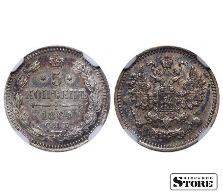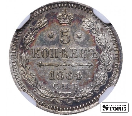 Монета Российской Империи номиналом 5 копеек, выпущенная в 1864 году в период правления императора Александра II (1855–1881). Материал — серебро, вес 1,02 г. Оценка NGC — AU DETAILS.