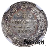 Российская Империя, 5 копеек, 1864 год, SPB-NF, NGC AU DETAILS, Александр II