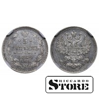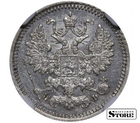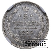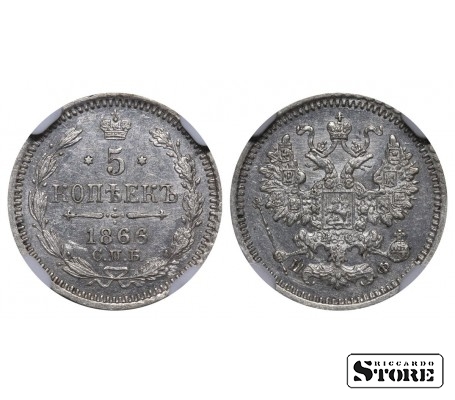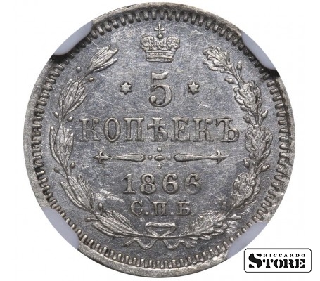 Монета Российской Империи номиналом 5 копеек, выпущенная в 1866 году в период правления императора Александра II (1855–1881). Материал — серебро, вес 1,02 г. Оценка NGC — UNC DETAILS.