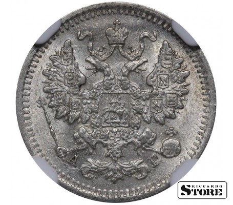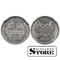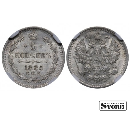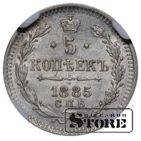 Монета Российской Империи номиналом 5 копеек, выпущенная в 1885 году на Санкт-Петербургском монетном дворе в период правления императора Александра III (1881–1894). Материал — серебро, вес 0,9 г. Сертифицирована NGC с оценкой UNC DETAILS. Отлично сохранившийся коллекционный экземпляр с чётким чеканом и естественным блеском.