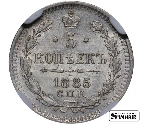 Российская Империя, 5 копеек, 1885 год, SPB-AG, NGC UNC DETAILS, Александр III