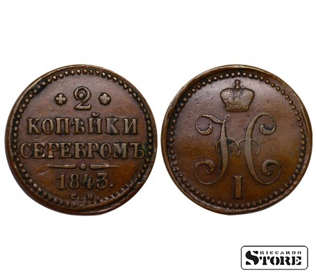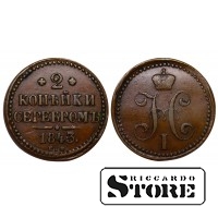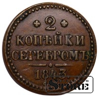 Монета Российской Империи номиналом 2 копейки, выпущенная в 1843 году в период правления императора Николая I (1825–1855). Материал — медь, вес 20,48 г.